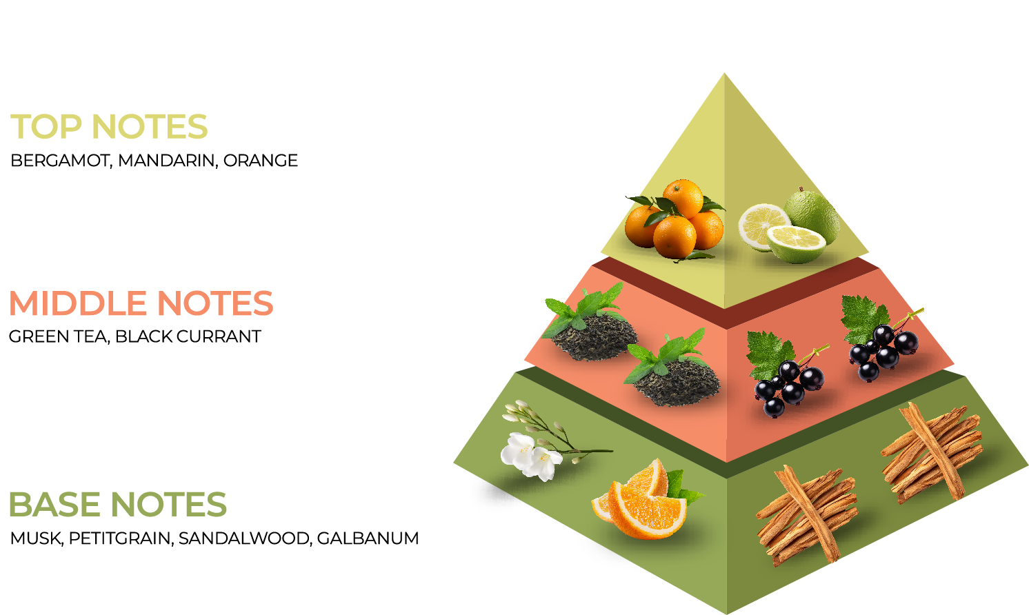 • Heart Notes: Green Tea, Blackcurrant, Petitgrain